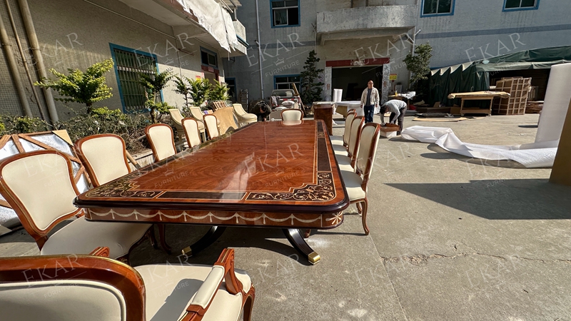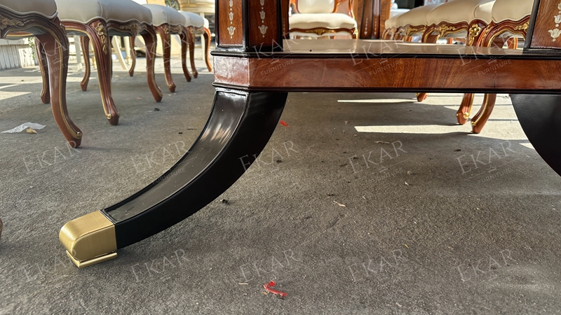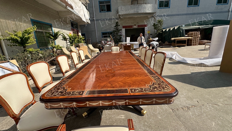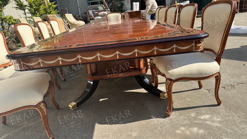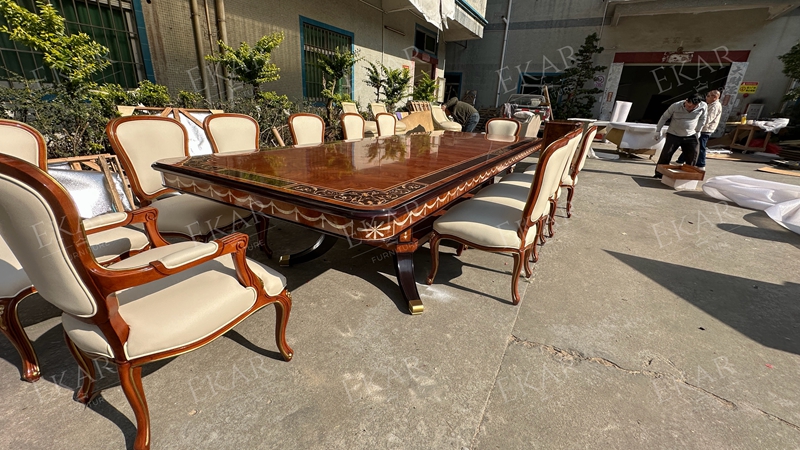 Ekar’s carved dining set combines elegant craftsmanship and luxurious wood, perfect for enhancing any classic dining room.