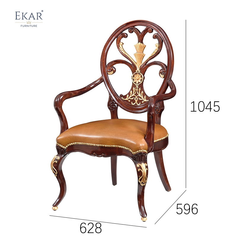 Ekar’s classic carved armchair offers luxurious seating with timeless style, ideal for dining rooms needing sophistication.